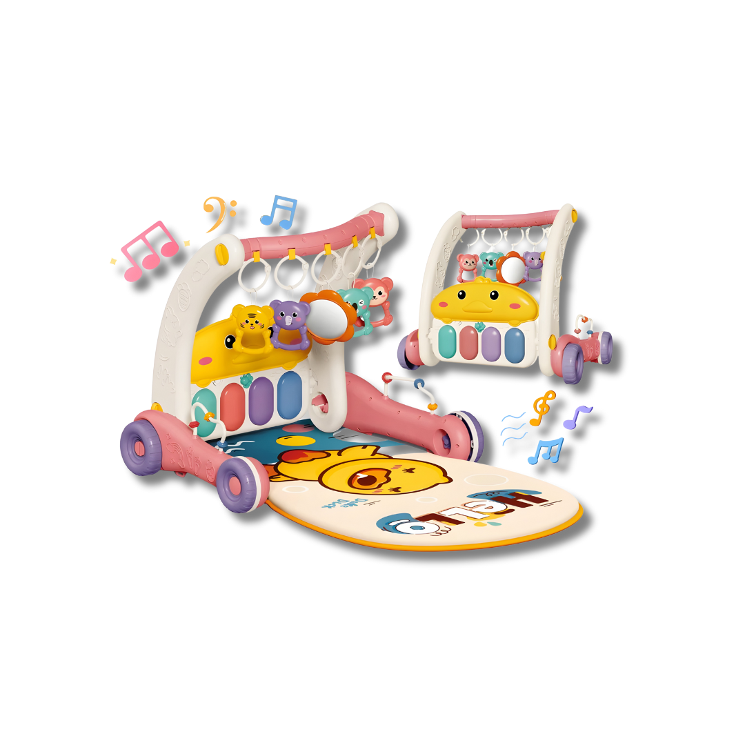 Kjo lodër 2-në-1 për bebe kombinon tapetin e lojës me pianon e shqelmave dhe një walker të sigurt për hapat e parë. Me ngjyra të gjalla, lodra varëse dhe tinguj muzikorë, stimulon shqisat dhe zhvillimin motorik të bebes. Dizajni praktik dhe i qëndrueshëm e bën të përsosur për lojë, zvarritje dhe ecje të hershme.